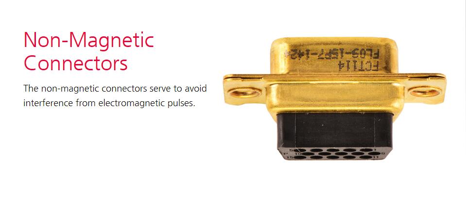 Non-Magnetic Connectors 无磁连接器,提供各类外壳、尺寸的定制。精密仪表测试无磁连接器数据为:?μr?≤ 1,0025。